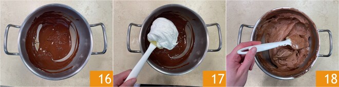 Wenn sie eine Temperatur von 45° erreicht hat 16, die halbgeschlagene Sahne auf einmal hinzufügen 17, zuerst mit dem Schneebesen und dann mit dem Spatel mischen 18.