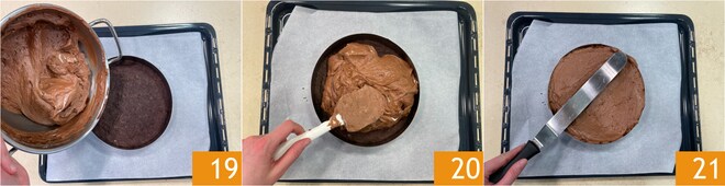 Den Ring wieder auf den Sablé-Boden legen, damit die Torte ihre Form behält, dann die Mousse hineingießen 19, gleichmäßig verteilen 20, dann mit dem Spatel glätten 21. Für zwei Stunden in den Kühlschrank stellen.