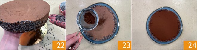 Die gefestigte Torte herausnehmen, den Ring entfernen und seitlich mit den Schokoladensplittern bedecken 22. Die Oberfläche mit Kakao bestreuen 23 und Ihre Mousse-Torte aus Bitterschokolade auf Sablé-Boden ist bereit, genossen zu werden 24.