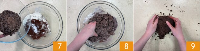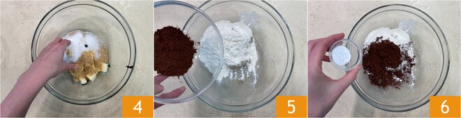 Den Teig kneten, um einen Laib zu formen 4, und dann auch das Mehl, den ungesüßten Kakao 5 und das Natron 6 hinzufügen.