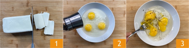 Um Mozzarella und Schinken in Carrozza zuzubereiten, schneidet die Mozzarella in dünne Scheiben 1. In einem Teller 3 Eier aufschlagen, mit Salz und Pfeffer würzen 2 und mit einer Gabel verquirlen 3.