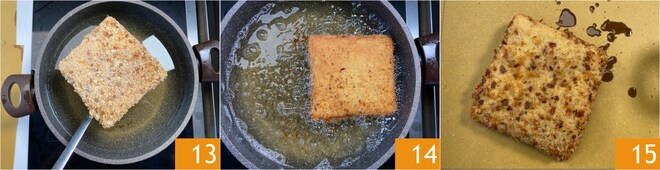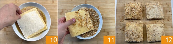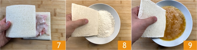 Legt eine weitere Scheibe Brot darauf 7 und drückt die Ränder vorsichtig flach. Zuerst im Mehl wenden 8, dann gut alle Ränder im Ei verschließen 9.