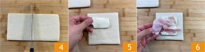 Schneidet 8 quadratische Scheiben Brot von etwa 12 cm 4, wenn ihr bereits geschnittenes Brot findet, umso besser. Belegt jede Scheibe mit Mozzarella 5 und gekochtem Schinken 6.