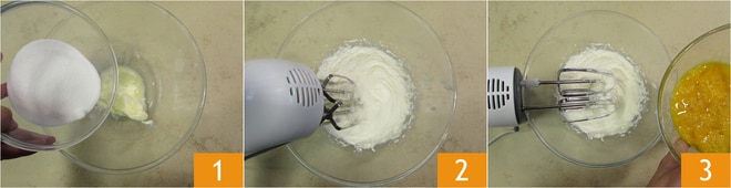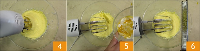 Schlagen Sie weiter mit dem Handrührgerät 4. Sobald alles gut vermischt ist, fügen Sie den Heumilch-Joghurt mit Mango und Passionsfrucht hinzu 5, arbeiten Sie weiter, um alles gut zu vermengen, und aromatisieren Sie dann mit Zitronenschale 6.