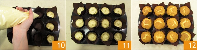 Verteilen Sie jeweils 80 g in den Förmchen, die auf einem Muffinblech angeordnet sind 10 11: Mit diesen Mengen erhalten Sie 12 Muffins. Backen Sie sie im vorgeheizten, statischen Ofen bei 180° etwa 30 Minuten lang. Sobald sie schön goldbraun sind, holen Sie sie aus dem Ofen 12 und lassen Sie sie auf Zimmertemperatur abkühlen, bevor Sie Ihre Muffins mit Mango- und Passionsfrucht-Joghurt genießen.
