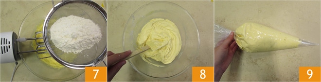 Sieben Sie das Mehl und das Backpulver und fügen Sie es nach und nach hinzu 7, während Sie ständig mit dem Handrührgerät rühren, bis eine schöne dicke Masse entsteht 8. Mit Hilfe eines Spatels geben Sie die Masse in einen Spritzbeutel 9.