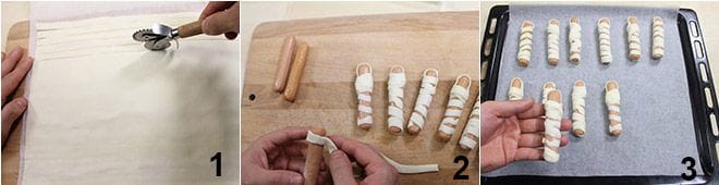 Um die Mumien-Würstchen vorzubereiten, beginnen Sie mit einer Rolle fertigem Blätterteig (oder Sie können ihn selbst zubereiten, indem Sie dem Rezept folgen, das Sie hier finden); schneiden Sie 12 Streifen davon, die etwa 1 cm breit sind, mit einem Teigrädchen 1. Wickeln Sie jedes Würstchen mit einem Blätterteigstreifen ein, indem Sie es spiralförmig darum wickeln (lassen Sie das letzte Stück des Würstchens unbedeckt, das als Gesicht der Mumie fungiert) 2. Wenn alle Würstchen "verbunden" sind, legen Sie sie auf ein mit Backpapier ausgelegtes Blech 3.