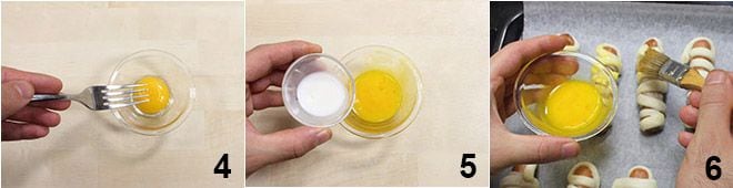 In einer separaten Schale schlagen Sie das Eigelb mit einer Gabel 4, fügen Sie Milch hinzu 5 und bestreichen Sie jede Mumie mit der erhaltenen Mischung 6.