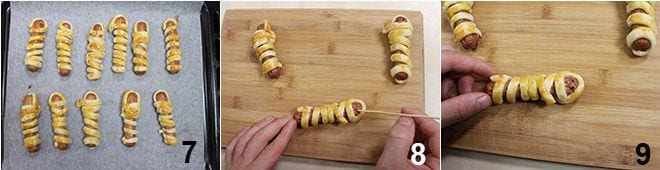Backen Sie alles im vorgeheizten Ofen bei 180° für 40 Minuten 7. Sobald die Mumien goldbraun sind, schalten Sie den Ofen aus, lassen Sie sie abkühlen und machen Sie dann die Augen: Mit einem Holzspieß zwei Löcher in den unbedeckten Teil des Würstchens stechen 8 und die Mohnsamen hineinsetzen 9. Ihre Mumien-Würstchen sind fertig: Frohes Halloween!