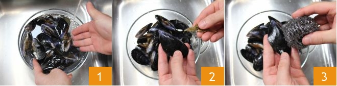 Um die Muscheln alla busara zuzubereiten, kümmern Sie sich zuerst um die Reinigung der Schalentiere. Spülen Sie sie unter fließendem Wasser ab 1 und entfernen Sie dann mit der Rückseite eines Messers alle äußeren Wucherungen. Ziehen Sie dann mit den Händen den Bart ab 2 und reinigen Sie schließlich mit einem Stahlschwamm die gesamte Oberfläche. Bei Zweifeln können Sie unsere Kochschule zu Rate ziehen: Wie man Miesmuscheln reinigt und öffnet.