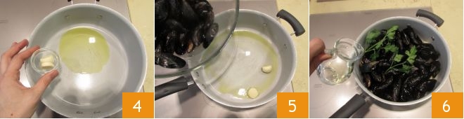 Schälen Sie die zwei Knoblauchzehen und geben Sie sie in einen Topf, in dem Sie etwas Öl erhitzt haben 4. Lassen Sie sie goldbraun werden, dann fügen Sie die Muscheln 5 und die Petersiliensträußchen hinzu; Löschen Sie mit dem Weißwein ab 6
