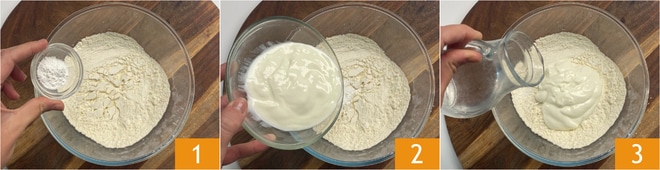 Um das Naan-Brot mit Joghurt herzustellen, geben Sie das Mehl in eine Schüssel, fügen dann die Hefe 1, den Naturjoghurt 2 und das Wasser 3 hinzu.