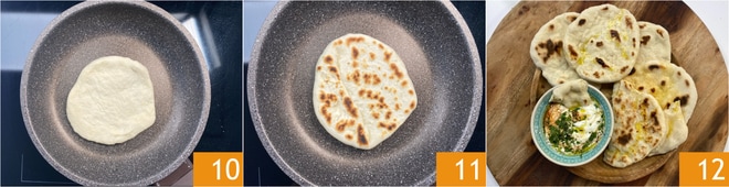 Braten Sie die Naan in einer antihaftbeschichteten Pfanne bei hoher Hitze etwa 3-4 Minuten auf der ersten Seite 10 und 2 Minuten auf der anderen Seite, oder bis sie goldbraun sind 11. Servieren Sie Ihr Naan-Brot mit Joghurt noch warm 12!