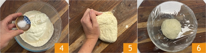 Fügen Sie auch das Salz 4 hinzu und vermengen Sie alles mit einem Löffel. Dann geben Sie den Teig auf eine Arbeitsfläche und kneten ihn mit den Händen, bis ein glatter und homogener Teig entsteht 5. Lassen Sie den Teig in der Schüssel, bedeckt mit Frischhaltefolie, etwa eine Stunde ruhen 6.