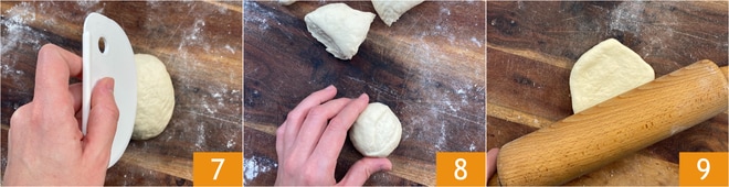 Nach dieser Zeit teilen Sie den Teig in 6 Portionen 7, formen Sie Kugeln 8 und rollen Sie sie mit einem Nudelholz aus, um Scheiben von etwa 3 mm Dicke zu erhalten 9. Wenn sich der Teig zurückzieht, lassen Sie die Scheiben ein paar Minuten ruhen und rollen Sie sie erneut aus, wobei Sie auch die Hände zur Hilfe nehmen können.