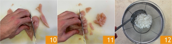 In der Zwischenzeit reinigen Sie die Hühnerbrust 10 und schneiden Sie sie in etwa 1 cm große Stücke 11. Nach der Kochzeit den Reis abgießen und in einem Sieb abkühlen lassen 12.