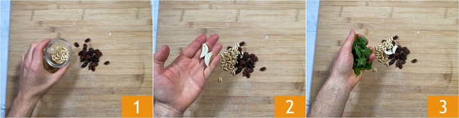 Um das neapolitanische Ragout vorzubereiten, machen Sie zuerst die Rouladen. Legen Sie die Rosinen (ohne sie einzuweichen), die Pinienkerne 1, den geschälten Knoblauch ohne Keim 2 und die Petersilienblätter 3 auf das Schneidebrett.<\/p>