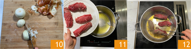 Schälen und hacken Sie die Zwiebeln fein 10. Gehen Sie an den Herd. Erhitzen Sie in einem großen Topf, vorzugsweise mit doppeltem Boden, einen Schuss Öl und geben Sie dann die Rouladen hinein 11, lassen Sie sie bei starker Hitze versiegeln. Drehen Sie sie vorsichtig mit den Zangen 12, braten Sie sie von allen Seiten gut an und stellen Sie sie dann beiseite.<\/p>