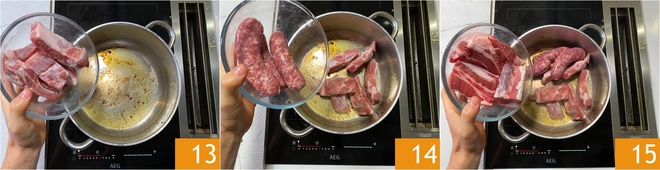 Setzen Sie mit den anderen Fleischstücken fort, fügen Sie zuerst die Schweinerippen hinzu 13. Fügen Sie dann die Würste 14 und das Rindfleisch 15 hinzu.<\/p>