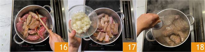 Braten Sie alle Fleischstücke gut an 16. Zu diesem Zeitpunkt die Zwiebel hinzufügen 17 und die Hitze leicht erhöhen. Zwei Minuten lang dünsten und schließlich mit Rotwein ablöschen 18, um den Boden zu deglasieren.<\/p>