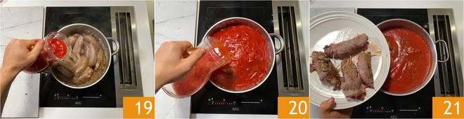 Sobald der Alkohol verdunstet ist, fügen Sie die Tomatenpassata hinzu 19, spülen Sie den Krug mit 2 Litern Wasser aus 20 und tauchen Sie die Rouladen ein 21.<\/p>