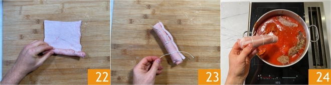 Rollen Sie das Schweinegewebe 22 auf und binden Sie es mit einer Schnur 23. Fügen Sie es zur Sauce hinzu 24 und geben Sie eine gute Prise Salz hinzu.<\/p>