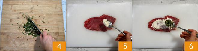 Hacke alles ziemlich fein 4. Legen Sie eine Scheibe Rinderlende auf ein Schneidebrett, wenn sie zu dick ist, klopfen Sie sie ein wenig zwischen zwei Backpapierblätter. Streuen Sie etwas geriebenen Pecorino Romano darüber 5 und die gerade hergestellte Mischung 6; lassen Sie einen Rand frei und bedecken Sie nicht das ganze Fleischstück.<\/p>