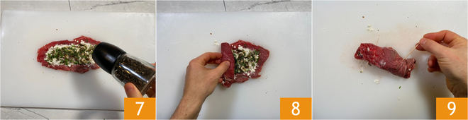 Fügen Sie eine Prise schwarzen Pfeffer hinzu 7. Rollen Sie es auf der kurzen Seite so: Schlagen Sie die Enden nach innen, dann rollen Sie das Fleisch 8 und befestigen Sie die Rouladen mit Zahnstocher, zwei an den Seiten 9 und einen in der Mitte 9.<\/p>