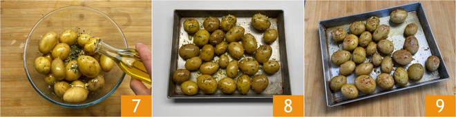 Zum Schluss einen Schuss Olivenöl 7 hinzugeben, gründlich mischen und auf ein Backblech geben 8. Im vorgeheizten statischen Ofen bei 180°C 45-50 Minuten backen; rühren Sie alle 10-15 Minuten um. Die neuen Kartoffeln mit Rosmarin sind fertig 9.