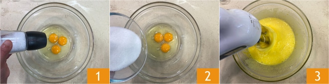 Um den Nua-Kuchen mit Feigen zuzubereiten, schlagen Sie zuerst in einer Schüssel die Eier auf, geben eine Prise Salz dazu 1, fügen den Zucker hinzu 2 und schlagen alles mit einem elektrischen Rührgerät auf 3.