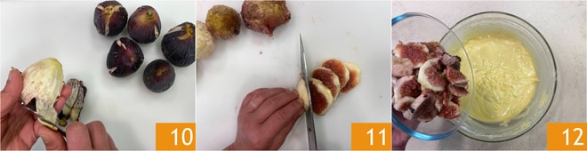 Schälen Sie die Feigen 10, schneiden Sie sie in Stücke 11 und fügen Sie sie dem Teig hinzu 12.