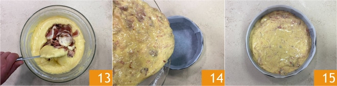 Integrieren Sie sie gut durch Rühren 13. Gießen Sie den Teig in eine mit Backpapier ausgelegte Springform mit 20 cm Durchmesser 14 und glätten Sie die Oberfläche 15.