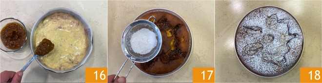 Auf der Oberfläche fügen Sie die Feigenkonfitüre hinzu 16 und backen Sie in einem vorgeheizten Umluftofen bei 180°C etwa 60 Minuten. Sobald der Kuchen fertig ist, lassen Sie ihn im abgeschalteten Ofen mit leicht geöffneter Tür 5 Minuten abkühlen. Entformen und vollständig abkühlen lassen. Dekorieren Sie mit Puderzucker 17. Der Nua-Kuchen mit Feigen ist bereit, genossen zu werden 18.