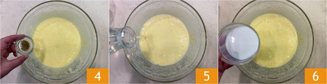 Fügen Sie den Vanilleextrakt 4, das Sonnenblumenöl 5 und die Milch 6 hinzu. Mischen Sie, um die Zutaten zu verbinden.