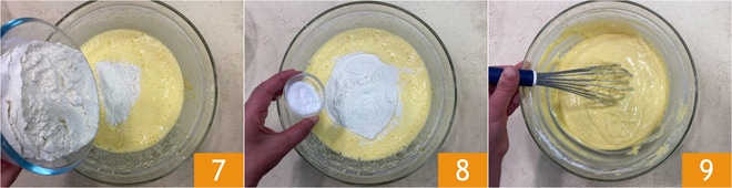 Fügen Sie dann das zuvor gesiebte Mehl 7 und das Backpulver 8 hinzu. Mischen Sie mit einem Schneebesen von Hand 9, bis Sie einen homogenen und klumpenfreien Teig erhalten.