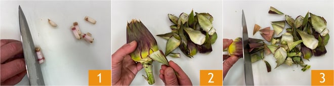 Um die Nudeln alla Vignarola zuzubereiten, beginnen Sie damit, den Speck in Streifen von einem halben Zentimeter zu schneiden 1. Wie man Artischocken putzt: Entfernen Sie die härteren äußeren Blätter 2, dann den Stiel und reinigen Sie die Basis. Entfernen Sie die Spitzen mit einem scharfen Schnitt 3.