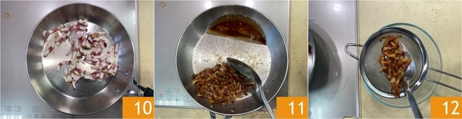 Geben Sie den Speck in eine heiße Pfanne 10 und braten Sie ihn, bis er knusprig und goldbraun ist 11, dann legen Sie ihn in ein Sieb 12 und bewahren Sie das Bratfett in der Pfanne auf.