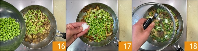 Auch die Erbsen hinzufügen 16, salzen 17, mit einem Deckel abdecken 18 und 10 Minuten bei mittlerer Hitze kochen lassen.