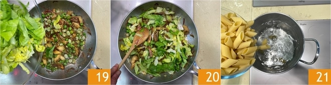 Zum Schluss den Kopfsalat hinzufügen 19 und einige Minuten kochen, gerade lange genug, um ihn zusammenfallen zu lassen 20. In der Zwischenzeit die rigate Penne in gesalzenem kochendem Wasser kochen 21.