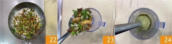 Inzwischen ist das Gemüse gekocht 22: Nehmen Sie die Hälfte heraus und geben Sie es in einen Behälter 23, dann pürieren Sie es mit dem Stabmixer 24.