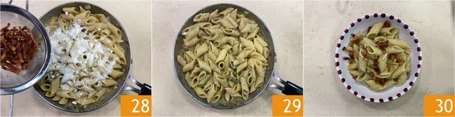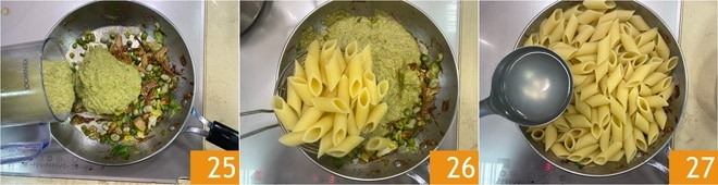 Gießen Sie die erhaltene Creme in die Pfanne mit dem restlichen Gemüse 25, dann die Nudeln sehr al dente abtropfen lassen 26. Fügen Sie eine Kelle Nudelwasser hinzu und beenden Sie das Kochen 27.