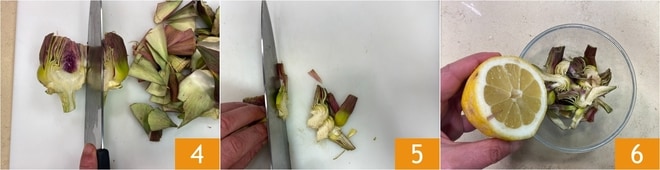 Teilen Sie die Artischocken in zwei Hälften 4 und kratzen Sie das innere Heu heraus. Schneiden Sie die Artischocken in dünne Scheiben 5 und legen Sie sie sofort in eine Schüssel mit Zitronensaft, um ein Anlaufen zu verhindern 6.