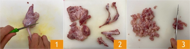 Um die Pasta mit Kaninchenragout und Blumenkohl zuzubereiten, entbeinen Sie zuerst das Kaninchen 1 und bewahren die Knochen und Reste auf 2. Schneiden Sie das Fleisch in etwa 0,5 cm große Würfel 3.