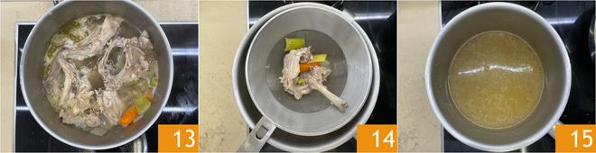 Nach der Kochzeit der Brühe 13, filtern Sie sie 14 und gießen die Flüssigkeit in einen kleinen Topf, wobei Sie darauf achten, ein paar Kellen beiseite zu halten, die für das Ragout benötigt werden. Stellen Sie den kleinen Topf auf den Herd und lassen Sie es bei mittlerer bis hoher Hitze etwa 20 Minuten lang reduzieren 15; es sollte eindicken, bis es die Konsistenz eines Sirups erreicht.