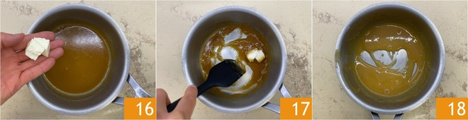Sobald die Flüssigkeit reduziert ist, nehmen Sie den kleinen Topf vom Herd und fügen die kalte Butter nach und nach hinzu 16, rühren Sie vorsichtig um 17, um sie gleichmäßig zu integrieren und eine glatte und homogene Creme zu erhalten 18.
