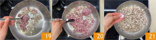 Behalten Sie die Reduktion bei und nehmen Sie die Pfanne, in der Sie das Gemüse gekocht haben, reinigen Sie sie mit Küchenpapier und gießen Sie einen weiteren Schuss Öl hinein. Wenn es gut heiß ist, fügen Sie das Kaninchenfleisch hinzu 19 und braten es bei mittlerer Hitze etwa 10 Minuten lang an 20, dann salzen Sie 21.