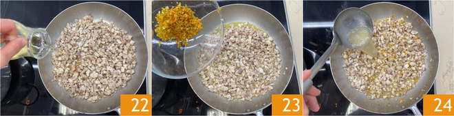 Gießen Sie den Weißwein hinzu 22 und lassen ihn verdampfen, dann fügen Sie das zuvor zubereitete Soffritto hinzu 23. Gießen Sie die 2 beiseite gelegten Kellen Brühe hinzu 24 und kochen Sie weiter bei mittlerer bis niedriger Hitze etwa 20 Minuten lang.