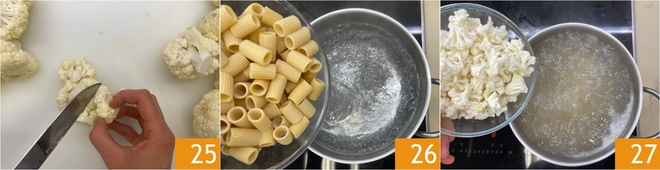 In der Zwischenzeit säubern Sie den Blumenkohl und trennen die Röschen 25. Bringen Sie einen Topf mit gesalzenem Wasser zum Kochen und kochen die Pasta al dente 26. Wenn noch 5 Minuten bis zum Ende der Kochzeit der Pasta übrig sind, geben Sie auch die Blumenkohlröschen hinzu 27.