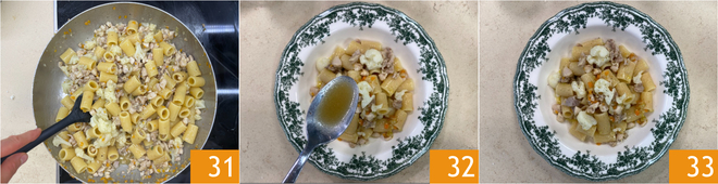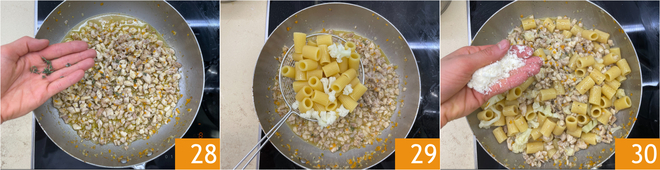 Nachdem das Kaninchenragout gekocht ist, würzen Sie es mit den Thymianblättern 28. Gießen Sie die Pasta und den Blumenkohl ab und geben sie direkt in die Pfanne mit dem Ragout 29. Schwenken Sie alles gut durch, dann schalten Sie den Herd aus und fügen den geriebenen Käse hinzu 30.