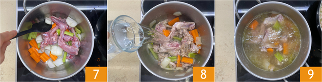 Braten Sie weiter an, bis sie gut gebräunt sind 7, dann bedecken Sie es mit kaltem Wasser (oder Wasser und Eis) 8 und lassen es etwa eine Stunde köcheln 9.
